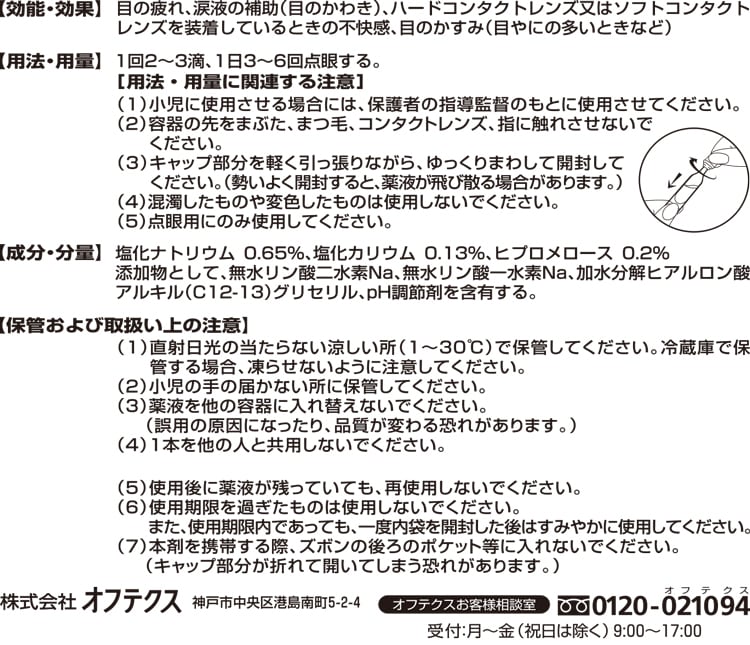 | 目の疲れ、涙液の補助(目のかわき)、ハードコンタクトレンズ又はソフトコンタクトレンズを装着しているときの不快感、目のかすみ(目やにの多いときなど) |