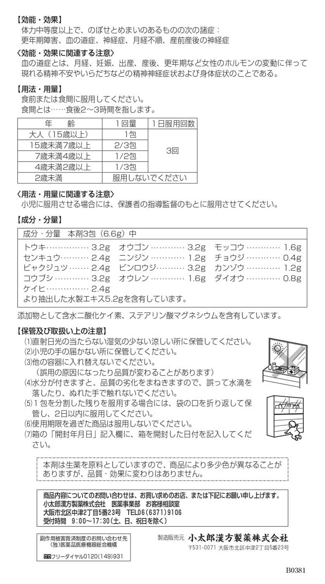 商品内容についてのお問い合わせは、お買い求めのお店、または下記にお願い申し上げます。 小太郎漢方製薬株式会社 医薬事業部 お客様相談室 大阪市北区中津2丁目5番23号 TEL06(6371)9106 受付時間9:00-17:30(土、日、祝日を除く) 製造販売元 小太郎漢方製薬株式会社 〒531-0071 大阪市北区中津2丁目5番23号
