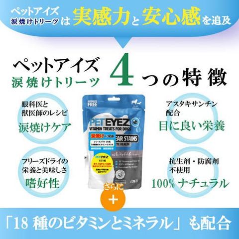 ●18種類のビタミンとミネラル配合の目の健康維持のためのサプリメントトリーツ。フリーズドライで嗜好性抜群のペット用サプリメントトリーツ。