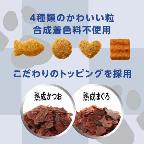 | 穀類(とうもろこし、コーングルテンミール、小麦粉)、肉類(ミートミール、チキンレバーパウダー)、油脂類(動物性油脂)、魚介類(フィッシュエキス、白身魚エキス、熟成まぐろ、熟成かつお)、セレン酵母、ビタミン類(A、D3、E、K3、B1、B2、パントテン酸、ナイアシン、B6、葉酸、ビオチン、B12、コリン、イノシトール)、ミネラル類(カルシウム、リン、ナトリウム、カリウム、塩素、鉄、コバルト、銅、マンガン、亜鉛、ヨウ素)、アミノ酸類(メチオニン、トリプトファン、タウリン)、クチナシ色素、酸化防止剤(ローズマリー抽出物、ミックストコフェロール) |