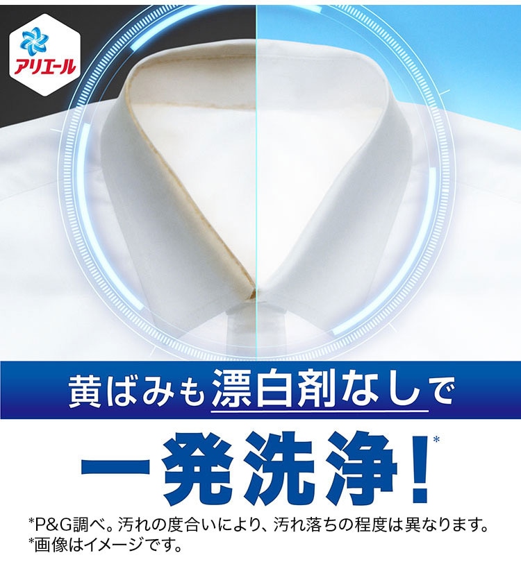 *1人工皮脂汚れでの試験。(P&G調べ)。汚れの度合いにより、汚れ落ちの程度は異なります。漂白剤は洗濯機直投入の条件でテスト。