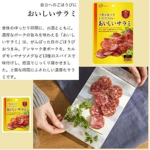 | ★一度は食べていただきたいおいしいサラミ:1袋(23g)当たり:エネルギー89kcal、たんぱく質6.9g、脂質5.9g、炭水化物2.0g、食塩相当量1.0g ★一度は食べていただきたい粗挽サラミ:1袋(30g)当たり:エネルギー 133kcal、たんぱく質 7.1g、脂質 9.9g、炭水化物 3.8g、食塩相当量 1.0g ★一度は食べていただきたい贅沢なチーズ鱈:1袋(32g)当たり:エネルギー110kcal、たんぱく質7.2g、脂質7.4g、炭水化物3.6g、食塩相当量1.0g ★一度は食べていただきたい燻製チーズ:1袋(64g)あたり:エネルギー231kcal、たんぱく質12.9g、脂質16.1g、炭水化物8.6g、食塩相当量2.0g、カルシウム429mg |