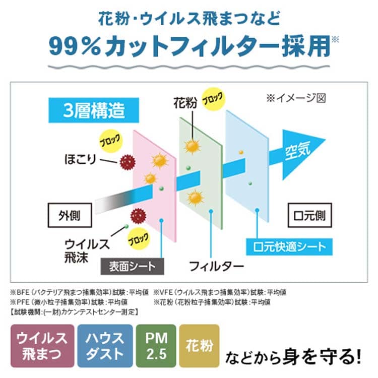 ●花粉やウイルス飛沫等を99%カットするフィルターを採用しています。