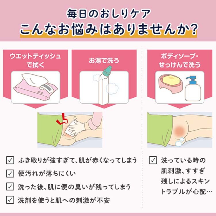 ・1.適量(1~3プッシュ)を手またはタオル・ティッシュにとり、おしりに広げて洗います。