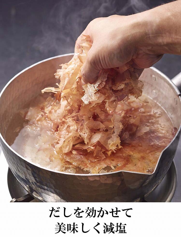 ●従来品の減塩だしつゆよりかつお節使用量を20%増量して、希釈時のだしの伸びや香りがとてもよく、麺、煮物、鍋もの、丼ぶり等色々な料理にお使いいただけます。