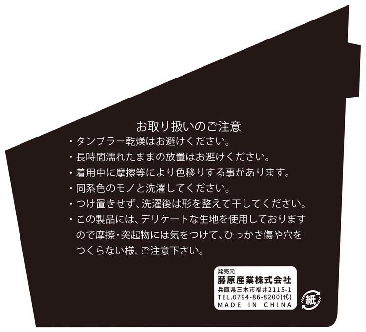 ・タンブラー乾燥はお避け下さい。長時間濡れたままの放置はお避け下さい。着用中に摩擦等により色移りすることがあります。・同系色のモノと洗濯してください。つけ置きせず、洗濯後は形を整えて干してください。・この製品には、デリケートな生地を使用しておりますので、摩擦・突起物には気を付けて、ひっかき傷や穴を作らない様、ご注意ください。