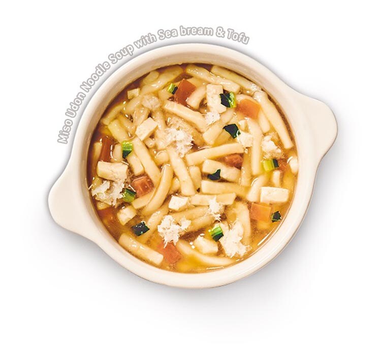 | 野菜(にんじん、こまつな)、豆腐(大豆、デキストリン、でん粉)(国内製造)、うどん(小麦を含む)、チキンブイヨン、たいほぐし身、はくさいペースト、ぶどう糖、みそ、しょうゆ、ミルクカルシウム、米酢/増粘剤(加工でん粉)、豆腐用凝固剤、ピロリン酸鉄、ビタミンD |