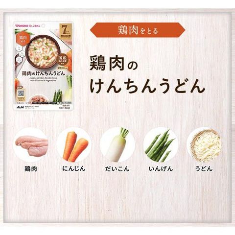 野菜(にんじん(国産)、だいこん、さやいんげん)、うどん(小麦を含む)、鶏ほぐし身、かつおだし、しょうゆ(大豆を含む)、ぶどう糖、チキンブイヨン、植物油脂、米酢、ミルクカルシウム、食塩/増粘剤(加工でん粉)、ピロリン酸鉄、ビタミンD