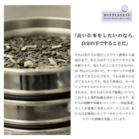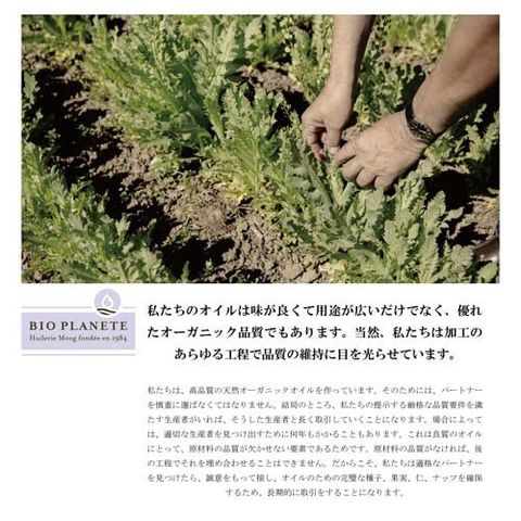 ●海外で圧搾して国内で充填した場合、圧搾から充填まで時間が経っているため品質劣化や酸化の懸念がありますが、BIOPLANETE有機アマニオイルはフランスブラムの工場で低温圧搾一番搾りで圧搾してその場ですぐに充填しているので、開封するまで品質劣化の心配がありません。