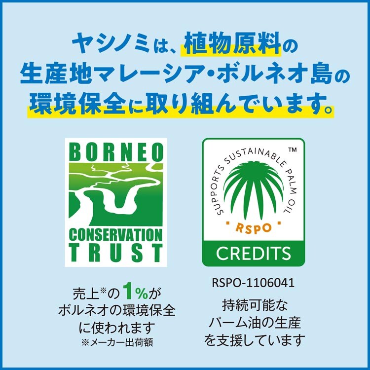●ヤシノミシリーズの無香料・無添加のコンセプトはそのままに、高い洗浄力で皮脂汚れも食品汚れもしっかり洗浄する洗たく洗剤。