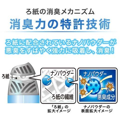 ●ナノパウダー※ が悪臭をすばやく強力に吸着し、消臭。※ナノレベルの孔(あな)を持つ、悪臭を吸着する消臭剤。