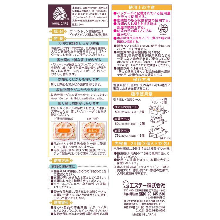 ●大切な衣類をしっかり防虫:防虫成分が約1年間安定した効果を発揮し大切な衣類を虫から守ります。 カシミヤ・ウールにもご使用いただけます。