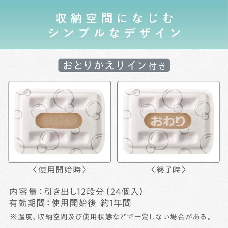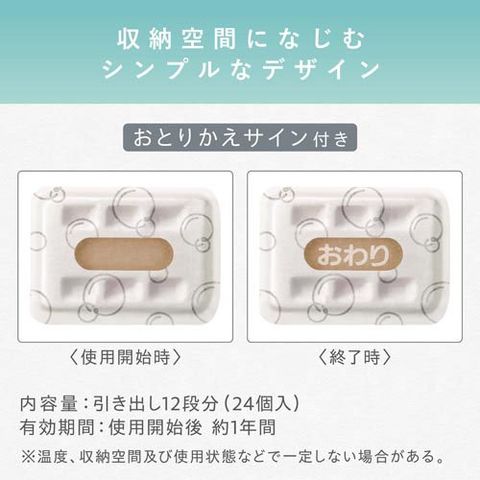 ・内容量 24個(2個入×12包) 中身の包装は、2個(引き出し1段分)ずつ分包。
