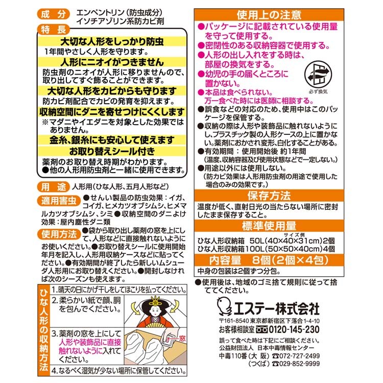 ●袋から取り出し薬剤の窓を上にして、人形などに直接触れないようにお使いください。