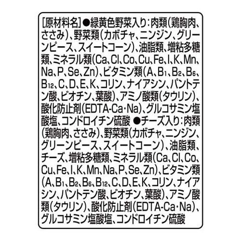 | ★緑黄色野菜入り:肉類(鶏胸肉、ささみ)、野菜類(カボチャ、ニンジン、グリーンピース、スイートコーン)、油脂類、増粘多糖類、ミネラル類(Ca、Cl、Co、Cu、Fe、I、K、Mn、Na、P、Se、Zn)、ビタミン類(A、B1、B2、B6、B12、C、D、E、K、コリン、ナイアシン、パントテン酸、ビオチン、葉酸)、アミノ酸類(タウリン)、酸化防止剤(EDTA-Ca・Na)、グルコサミン塩酸塩、コンドロイチン硫酸★チーズ入り:肉類(鶏胸肉、ささみ)、野菜類(カボチャ、ニンジン、グリーンピース、スイートコーン)、油脂類、チーズ、増粘多糖類、ミネラル類(Ca、Cl、Co、Cu、Fe、I、K、Mn、Na、P、Se、Zn)、ビタミン類(A、B1、B2、B6、B12、C、D、E、K、コリン、ナイアシン、パントテン酸、ビオチン、葉酸)、アミノ酸類(タウリン)、酸化防止剤(EDTA-Ca・Na)、グルコサミン塩酸塩、コンドロイチン硫酸 |