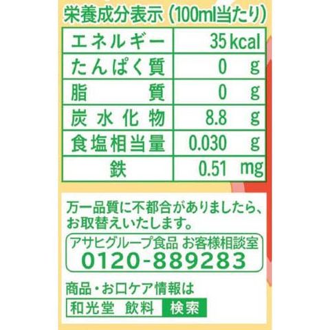 | 果実(りんご、レモン)、野菜(にんじん、赤ピーマン、アスパラガス、ほうれんそう、キャベツ、ブロッコリー、カリフラワー、かぼちゃ)、果糖ぶどう糖液糖/ビタミンC、ピロリン酸第二鉄 |