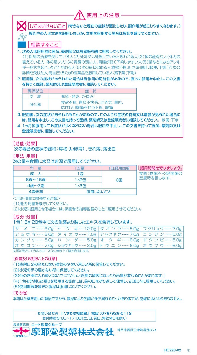 | 次の場合の症状の緩和:痔核(いぼ痔)、きれ痔、痔出血 |