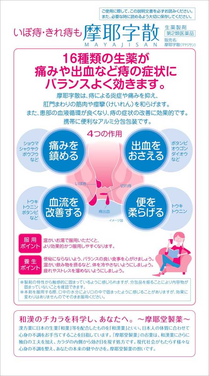 摩耶字散は、痔による炎症や痛みを抑え、肛門まわりの筋肉や痙攣(けいれん)を和らげます。