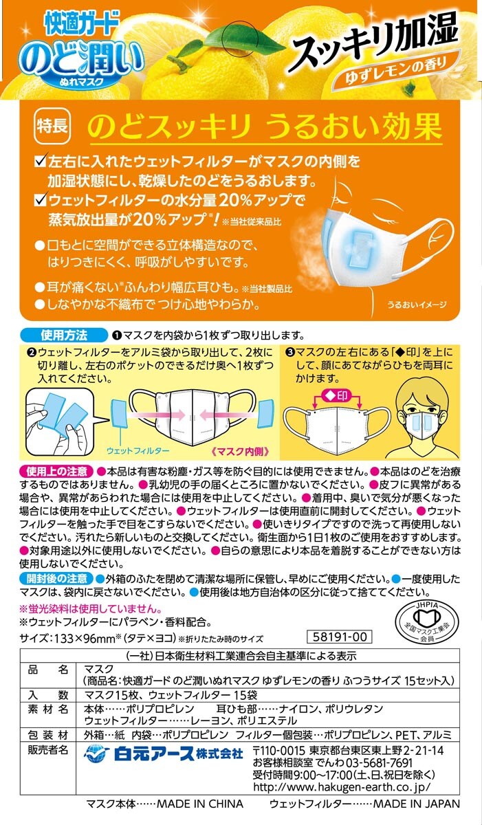 快適ガード のど潤いぬれマスク ゆずレモンの香り ふつうサイズ (15セット×2セット)