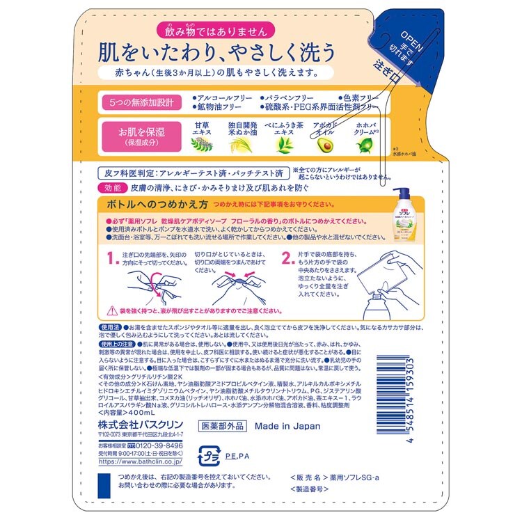 ・必ず「薬用ソフレ 乾燥肌ケアボディソープ フローラルの香り」のボトルにつめかえてください。