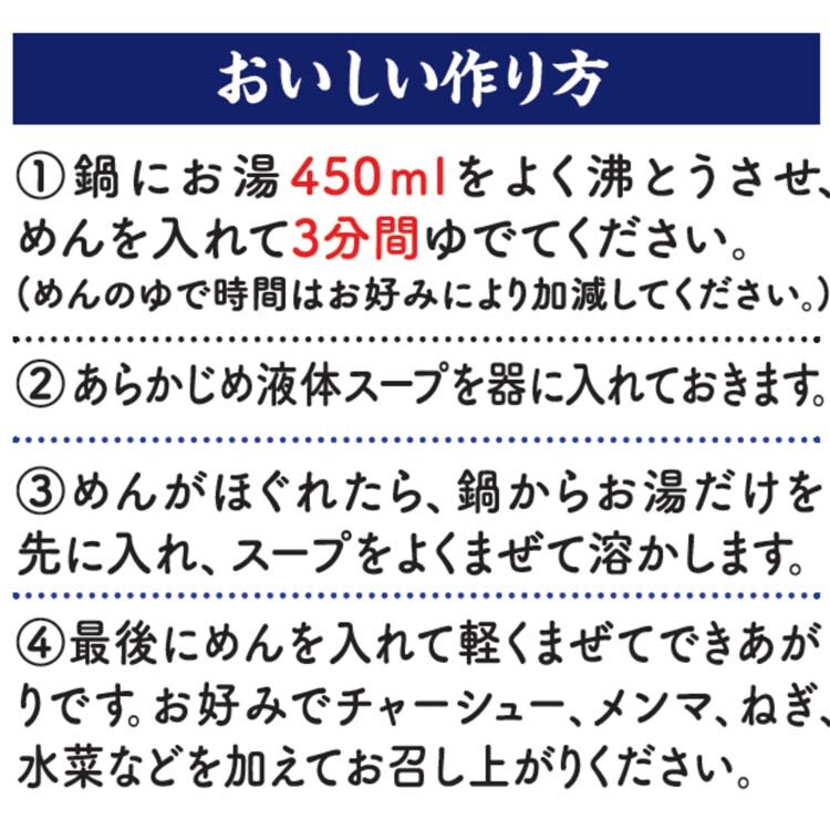 (1)鍋にお湯450mlをよく沸とうさせ、めんを入れて3分間ゆでてください。(めんのゆで時間はお好みにより加減してください。)