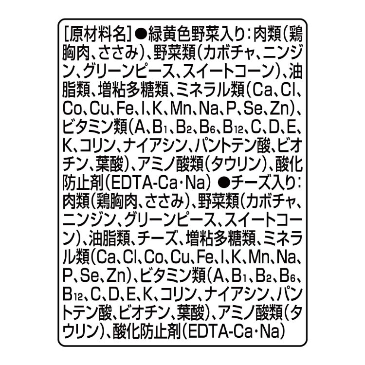 | ★緑黄色野菜入り:肉類(鶏胸肉、ささみ)、野菜類(カボチャ、ニンジン、グリーンピース、スイートコーン)、油脂類、増粘多糖類、ミネラル類(Ca、Cl、Co、Cu、Fe、I、K、Mn、Na、P、Se、Zn)、ビタミン類(A、B1、B2、B6、B12、C、D、E、K、コリン、ナイアシン、パントテン酸、ビオチン、葉酸)、アミノ酸類(タウリン)、酸化防止剤(EDTA-Ca・Na)★チーズ入り:肉類(鶏胸肉、ささみ)、野菜類(カボチャ、ニンジン、グリーンピース、スイートコーン)、油脂類、チーズ、増粘多糖類、ミネラル類(Ca、Cl、Co、Cu、Fe、I、K、Mn、Na、P、Se、Zn)、ビタミン類(A、B1、B2、B6、B12、C、D、E、K、コリン、ナイアシン、パントテン酸、ビオチン、葉酸)、アミノ酸類(タウリン)、酸化防止剤(EDTA-Ca・Na) |