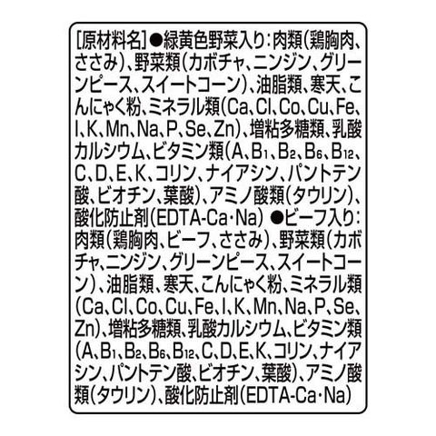 | ★緑黄色野菜入り:肉類(鶏胸肉、ささみ)、野菜類(カボチャ、ニンジン、グリーンピース、スイートコーン)、油脂類、寒天、こんにゃく粉、ミネラル類(Ca、Cl、Co、Cu、Fe、I、K、Mn、Na、P、Se、Zn)、増粘多糖類、乳酸カルシウム、ビタミン類(A、B1、B2、B6、B12、C、D、E、K、コリン、ナイアシン、パントテン酸、ビオチン、葉酸)、アミノ酸類(タウリン)、酸化防止剤(EDTA-Ca・Na)★ビーフ入り:肉類(鶏胸肉、ビーフ、ささみ)、野菜類(カボチャ、ニンジン、グリーンピース、スイートコーン)、油脂類、寒天、こんにゃく粉、ミネラル類(Ca、Cl、Co、Cu、Fe、I、K、Mn、Na、P、Se、Zn)、増粘多糖類、乳酸カルシウム、ビタミン類(A、B1、B2、B6、B12、C、D、E、K、コリン、ナイアシン、パントテン酸、ビオチン、葉酸)、アミノ酸類(タウリン)、酸化防止剤(EDTA-Ca・Na) |