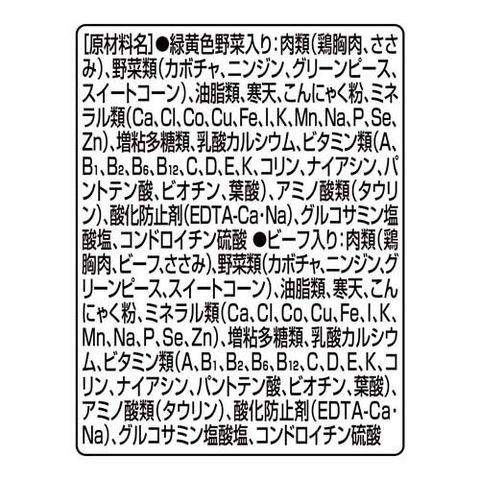 | ★緑黄色野菜入り:肉類(鶏胸肉、ささみ)、野菜類(カボチャ、ニンジン、グリーンピース、スイートコーン)、油脂類、寒天、こんにゃく粉、ミネラル類(Ca、Cl、Co、Cu、Fe、I、K、Mn、Na、P、Se、Zn)、増粘多糖類、乳酸カルシウム、ビタミン類(A、B1、B2、B6、B12、C、D、E、K、コリン、ナイアシン、パントテン酸、ビオチン、葉酸)、アミノ酸類(タウリン)、酸化防止剤(EDTA-Ca・Na)、グルコサミン塩酸塩、コンドロイチン硫酸★ビーフ入り:肉類(鶏胸肉、ビーフ、ささみ)、野菜類(カボチャ、ニンジン、グリーンピース、スイートコーン)、油脂類、寒天、こんにゃく粉、ミネラル類(Ca、Cl、Co、Cu、Fe、I、K、Mn、Na、P、Se、Zn)、増粘多糖類、乳酸カルシウム、ビタミン類(A、B1、B2、B6、B12、C、D、E、K、コリン、ナイアシン、パントテン酸、ビオチン、葉酸)、アミノ酸類(タウリン)、酸化防止剤(EDTA-Ca・Na)、グルコサミン塩酸塩、コンドロイチン硫酸 |