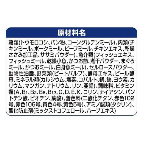 穀類(トウモロコシ、パン粉、コーングルテンミール)、肉類(チキンミール、ポークミール、ビーフミール、チキンエキス、乾燥ささみ加工品、ササミパウダー)、魚介類(フィッシュエキス、フィッシュミール、乾燥小魚、かつお節、煮干パウダー、まぐろミール、かつおミール、白身魚ミール)、セルロースパウダー、動物性油脂、野菜類(ビートパルプ)、酵母エキス、ビール酵母、ミネラル類(カルシウム、塩素、コバルト、銅、鉄、ヨウ素、カリウム、マンガン、ナトリウム、リン、亜鉛)、調味料、ビタミン類(A、B1、B2、B6、B12、C、D、E、K、コリン、ナイアシン、パントテン酸、ビオチン、葉酸)、着色料(二酸化チタン、赤色102号、赤色106号、黄色4号、黄色5号)、アミノ酸類(タウリン)、酸化防止剤(ミックストコフェロール、ハーブエキス)