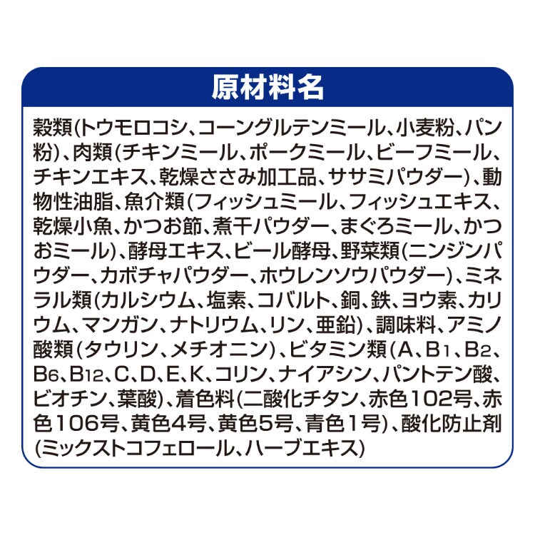 | 穀類(トウモロコシ、コーングルテンミール、小麦粉、パン粉)、肉類(チキンミール、ポークミール、ビーフミール、チキンエキス、乾燥ささみ加工品、ササミパウダー)、動物性油脂、魚介類(フィッシュミール、フィッシュエキス、乾燥小魚、かつお節、煮干パウダー、まぐろミール、かつおミール)、酵母エキス、ビール酵母、野菜類(ニンジンパウダー、カボチャパウダー、ホウレンソウパウダー)、ミネラル類(カルシウム、塩素、コバルト、銅、鉄、ヨウ素、カリウム、マンガン、ナトリウム、リン、亜鉛)、調味料、アミノ酸類(タウリン、メチオニン)、ビタミン類(A、B1、B2、B6、B12、C、D、E、K、コリン、ナイアシン、パントテン酸、ビオチン、葉酸)、着色料(二酸化チタン、赤色102号、赤色106号、黄色4号、黄色5号、青色1号)、酸化防止剤(ミックストコフェロール、ハーブエキス) |