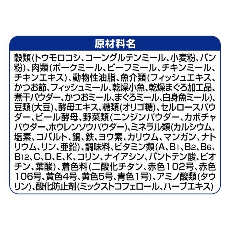| 穀類(トウモロコシ、コーングルテンミール、小麦粉、パン粉)、肉類(ポークミール、ビーフミール、チキンミール、チキンエキス)、動物性油脂、魚介類(フィッシュエキス、かつお節、フィッシュミール、乾燥小魚、乾燥まぐろ加工品、煮干パウダー、かつおミール、まぐろミール、白身魚ミール)、豆類(大豆)、酵母エキス、糖類(オリゴ糖)、セルロースパウダー、ビール酵母、野菜類(ニンジンパウダー、カボチャパウダー、ホウレンソウパウダー)、ミネラル類(カルシウム、塩素、コバルト、銅、鉄、ヨウ素、カリウム、マンガン、ナトリウム、リン、亜鉛)、調味料、ビタミン類(A、B1、B2、B6、B12、C、D、E、K、コリン、ナイアシン、パントテン酸、ビオチン、葉酸)、着色料(二酸化チタン、赤色102号、赤色106号、黄色4号、黄色5号、青色1号)、アミノ酸類(タウリン)、酸化防止剤(ミックストコフェロール、ハーブエキス) |