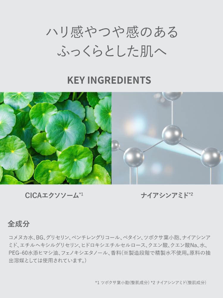 | コメヌカ水、BG、グリセリン、ペンチレングリコール、ベタイン、ツボクサ葉小胞、ナイアシンアミド、エチルヘキシルグリセリン、ヒドロキシエチルセルロース、クエン酸、クエン酸Na、水、PEG-60水添ヒマシ油、フェノキシエタノール、香料(※製造段階で精製水不使用。原料の抽出溶媒としては使用されています。) |