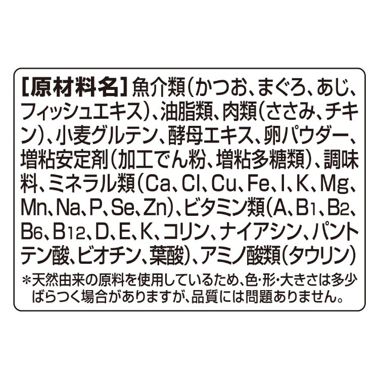 | 魚介類(かつお、まぐろ、あじ、フィッシュエキス)、油脂類、肉類(ささみ、チキン)、小麦グルテン、酵母エキス、卵パウダー、増粘安定剤(加工でん粉、増粘多糖類)、調味料、ミネラル類(Ca、Cl、Cu、Fe、l、K、Mg、Mn、Na、P、Se、Zn)、ビタミン類(A、B1、B2、B6、B12、D、E、K、コリン、ナイアシン、パントテン酸、ビオチン、葉酸)、アミノ酸類(タウリン)※天然由来の原料を使用しているため、色・形・大きさは多少ばらつく場合がありますが、品質には問題ありません。 |