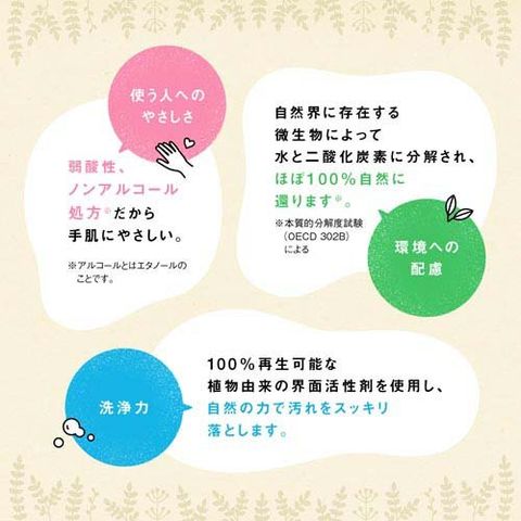 ●洗浄力:菜種油・ヒマワリ油から作られる植物由来の洗浄成分を使用し、自然の力で汚れをスッキリ落とします。