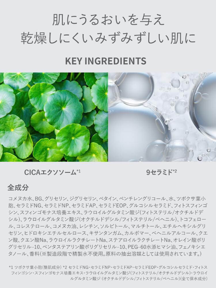 | コメヌカ水、BG、グリセリン、ジグリセリン、ベタイン、ペンチレングリコール、水、ツボクサ葉小胞、セラミドNG、セラミドNP、セラミドAP、セラミドEOP、グルコシルセラミド、フィトスフィンゴシン、スフィンゴモナス培養エキス、ラウロイルグルタミン酸ジ(フィトステリル/オクチルドデシル)、ラウロイルグルタミン酸ジ(オクチルドデシル/フィトステリル/ベヘニル)、トコフェロール、コレステロール、コメヌカ油、レシチン、ソルビトール、マルチトール、エチルヘキシルグリセリン、ヒドロキシエチルセルロース、キサンタンガム、カルボマー、ベヘニルアルコール、クエン酸、クエン酸Na、ラウロイルラクチレートNa、ステアロイルラクチレートNa、オレイン酸ポリグリセリル-10、ペンタステアリン酸ポリグリセリル-10、PEG-60水添ヒマシ油、フェノキシエタノール、香料(※製造段階で精製水不使用。原料の抽出溶媒としては使用されています。) |