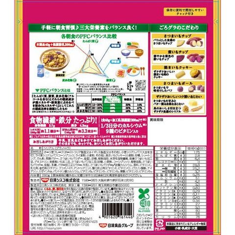 | オーツ麦フレーク(オーストラリア製造又はイギリス製造又はその他)、小麦シリアルパフ(大豆を含む)、ライ麦シリアルパフ(コーングリッツ、ライ麦粉、小麦粉、その他)、焼きいもクッキー(小麦粉、砂糖、ショートニング、でん粉、発酵バター、さつまいもバター、食塩)、砂糖、植物油脂、水溶性食物繊維、乾燥さつまいも加工品、デキストリン、乾燥紫いも加工品、さつまいもパフ加工品(砂糖、小麦粉、コーングリッツ、植物油脂、さつまいもパウダー、食塩)、乳糖、バター加工品(バター、牛乳)、さつまいもパウダー/炭酸カルシウム、香料、ビタミンC、乳化剤、着色料(クチナシ、フラボノイド、アントシアニン)、酸化防止剤(ビタミンE、ビタミンC)、ピロリン酸鉄、ナイアシン、カゼインNa、パントテン酸カルシウム、ビタミンB6、ビタミンB1、ビタミンB2、葉酸、ビタミンD、ビタミンB12 |