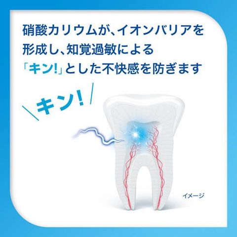 ●知覚過敏の人のことを考え、冷たいものや熱いものなどの刺激によって歯がシミる不快感や痛みを防ぐハミガキです。硝酸カリウムがカリウムイオンとなって、歯髄神経のまわりにイオンバリアを形成し、不快感や痛みを防ぎます。