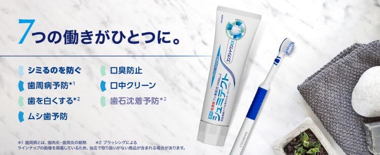 ●知覚過敏の人のことを考え、冷たいものや熱いものなどの刺激によって歯がシミる不快感や痛みを防ぐ、知覚過敏ケアを考えたオールインワンハミガキ。7つの働きがひとつになったコンプリートワンEXミガキ。シミるのを防ぐ、歯周病予防※1、歯を白くする※2、ムシ歯予防、口臭防止、口中クリーン、歯石の沈着予防。(※1歯肉炎、歯周炎の総称 ※2ブラッシングによる)