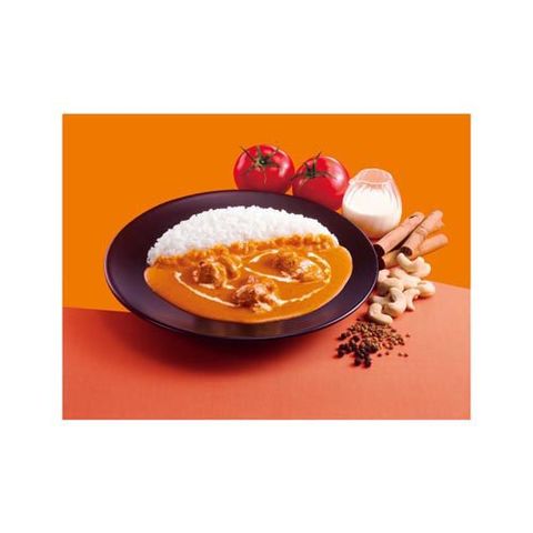 | 鶏肉(タイ産)、トマトピューレー、乳等を主要原料とする食品、炒め野菜(玉ねぎ、にんじん、ラード、その他)、クリーム、ヨーグルト、トマトペースト、油脂加工食品、カシューナッツペースト、ホワイトルウ、バター、砂糖、香味食用油、チャツネ、カレー粉、チキンブイヨン、バナナピューレ、デキストリン、食塩、しょうがペースト、カスリメティペースト、小麦粉、香辛料、にんにくペースト/トレハロース、増粘剤(加工でん粉)、調味料(アミノ酸等)、パプリカ色素、香料、香辛料抽出物、酸味料、(一部に乳成分・小麦・カシューナッツ・大豆・鶏肉・バナナを含む) |