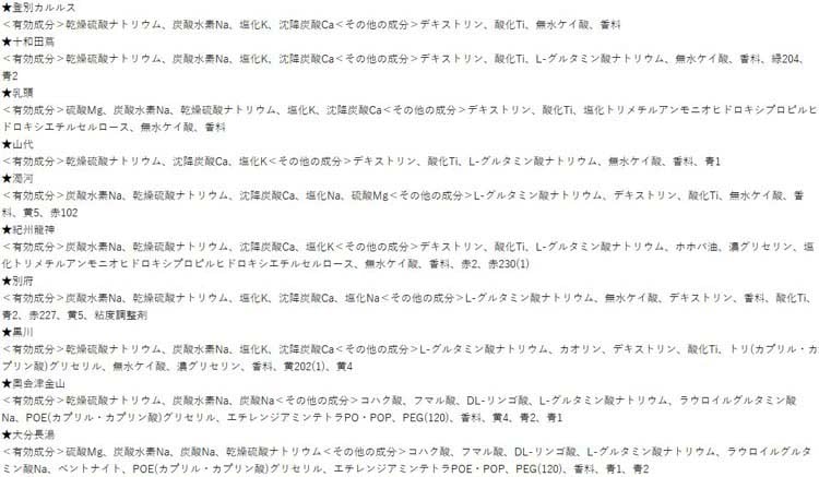 | ・十勝川モール:1包/広大な十勝平原の風の流れと太古からの植物の恵みを感じさせる香り/琥珀(こはく)色(透明タイプ) ・鳴子:1包/懐かしいぬくもりを感じる温泉の香り/紅葉色(透明タイプ) ・那須塩原:1包/渓谷の山々から漂う若葉と松葉の香り/青緑色(透明タイプ) ・野沢:2包/青い空と菜の香りをのせた、爽やかな風と新鮮な水の香り/青緑色(透明タイプ) ・熱海:2包/爽やかな海と、山々の新鮮な果実と花の香り/赤橙色(透明タイプ) ・修善寺:1包/桂川のせせらぎが運ぶ、清らかな花菖蒲の香り/紫色(透明タイプ) ・奥飛騨新穂高:1包/槍ヶ岳から流れるひんやりと澄んだ清風の香り/緑色(透明タイプ) ・湯原:1包/のんびりした時間の中で大切に育てられた、みずみずしい果実の香り/緑色(透明タイプ) ・道後:2包/瀬戸内の澄んだ青空と穏やかな日ざしが心にうかぶ爽やかな香り/緑がかった青色(透明タイプ) ・嬉野:1包/のんびりと漂う湯けむりと、ほのかな蜜柑の香り/黄金色(透明タイプ) ・登別カルルス:4包/日本一のオゾン地帯・オロフレ峠の原生林から漂う、澄み切った大気の香り/乳白色(にごりタイプ) ・十和田蔦:1包/ブナの森の薫風が運ぶ、すがすがしい新緑の香り/乳緑色(にごりタイプ) ・乳頭:4包/乳頭山からの涼風が運ぶ、心落ち着く緑葉の香り/まっ白な乳白色(にごりタイプ) ・山代:5包/加賀の爽やかな風が運ぶ、甘く上品な菖蒲の花の香り/乳青色(にごりタイプ) ・濁河:2包/御嶽山の澄んだ空気と静寂な原生林に漂う野趣豊かな温泉の香り/乳柿色(にごりタイプ) ・紀州龍神:2包/春の山々から漂う、優雅で清らかな花の香り/乳桃色(にごりタイプ) ・別府:2包/湯けむりの風の中に、ほのかに和柑橘を感じる温もりある香り/薄鈍色(にごりタイプ) ・黒川:3包/田の原川の渓流を抜ける爽やかな風にのって漂う、やさしい野花の香り/にごった緑色(にごりタイプ) ・奥会津金山:1包/緑あふれる只見川に漂う川霧を表現した幻想的な森林調の香り/緑色(炭酸湯) ・大分長湯:1包/爽やかな青空を連想させる甘酸っぱいラムネの香り/空色(炭酸湯) 30g×36包、40g×2包 |