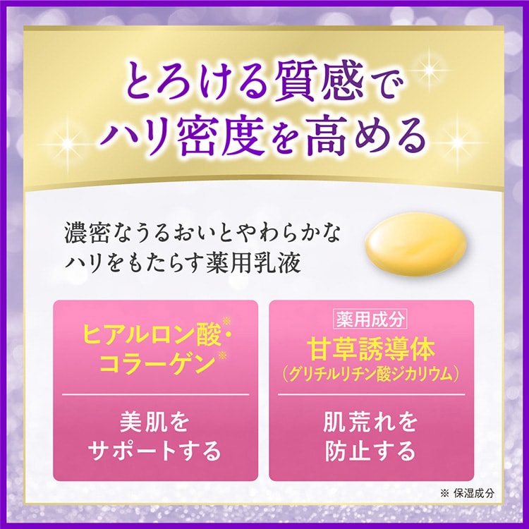 ●肌あたりがやわらかく、なめらかでとろけるようなテクスチャー。肌をやさしく包み込む薬用乳液です。