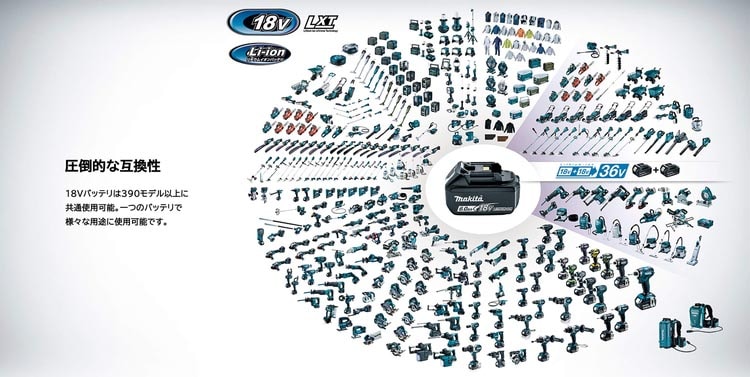 ●数多くのマキタ18Vリチウムイオンバッテリーモデルに共通でご使用いただけます。