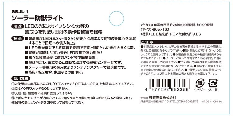 【藤原産業 セフティ-3 ソーラー防獣ライト SBJL-1の商品詳細】