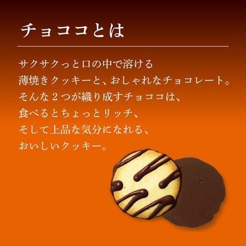 ●サクサク軽い食感が楽しめるラングドシャタイプの薄焼きクッキーとまろやかなチョコレートの絶妙なハーモニーが楽しめるチョココです。