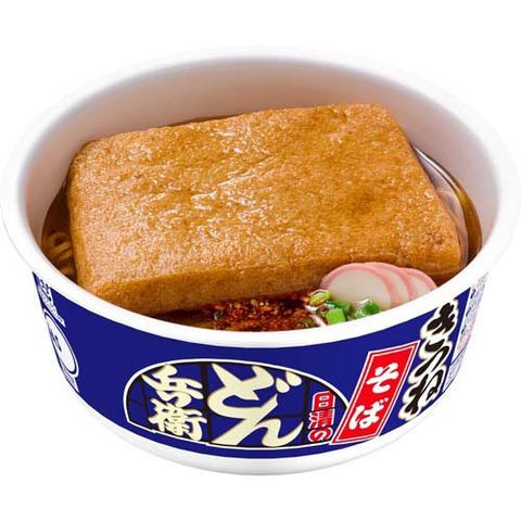 油揚げめん(小麦粉(国内製造)、そば粉、植物油脂、食塩、植物性たん白、しょうゆ、かつおぶし粉末、糖類)、スープ(糖類、食塩、かつおぶし調味料、粉末しょうゆ、かつおぶし粉末、ねぎ、七味唐辛子、たん白加水分解物、植物油脂、こんぶ調味料)、かやく(味付油揚げ、魚肉練り製品)/加工でん粉、調味料(アミノ酸等)、リン酸塩(Na)、炭酸Ca、カラメル色素、香料、酸化防止剤(ビタミンE)、pH調整剤、パプリカ色素、クチナシ色素、チャ抽出物、ビタミンB2、ビタミンB1、ベニコウジ色素、(一部に小麦・そば・乳成分・ごま・大豆・ゼラチンを含む)