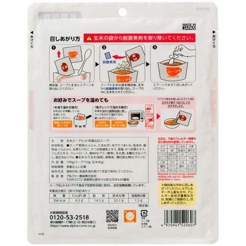| <スープ>野菜(にんじん、たまねぎ)、ゆでさつまいも、粉あめ、植物油、こんにゃく、水煮たけのこ、かつお節調味エキス、食塩、かつお節エキス、こんぶエキス/トレハロース、調味料(アミノ酸等)、乳化剤、水酸化カルシウム、塩化カルシウム <玄米>もち玄米(国産)、食物油/酸化防止剤(ビタミンE) |
