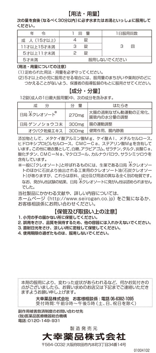 | 12錠(成人の1日最大服用量)中、次の成分を含みます。 [成分:分量:はたらき] 日局木クレオソート※:270mg:大腸の過剰なぜん動運動の正常化、腸管内の水分量の調整 日局ゲンノショウコ末:300mg:腸の運動調整 オウバク乾燥エキス:300mg:健胃作用、腸内静菌 添加物として、メタケイ酸アルミン酸Mg、ケイ酸Al、メチルセルロース、ヒドロキシプロピルセルロース、CMC-Ca、ステアリン酸Mg を含有しています。この他に糖衣層として、白糖、アラビアゴム、ゼラチン、タルク、炭酸Ca、酸化チタン、CMC-Na、マクロゴール、カルナウバロウ、サラシミツロウを含有しています。 ※一般に「クレオソート」と呼ばれるものには、生薬である日局 木クレオソートのほかに石炭より抽出される工業用のクレオソート油(石炭クレオソート)がありますが、これらは原料、成分及び用途の異なる全く別の物質です。なお、発がん性試験の結果、日局 木クレオソートに発がん性は認められませんでした。 |
