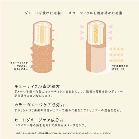 | 水、セテアリルアルコール、ジメチコン、DPG、グリセリン、セバシン酸ジエチル、ベヘニルPGトリモニウムクロリド、ベヘントリモニウムクロリド、加水分解シルク、セリン、プロリン、グルタミン酸Na、アルギニン、アラニン、加水分解コンキオリン、ポリクオタニウム-107、クエン酸、(加水分解シルク/PG-プロピルメチルシランジオール)クロスポリマー、γ-ドコサラクトン、ミリスチン酸PPG-3ベンジルエーテル、アサイヤシ果実油、エタノール、ベヘニルアルコール、パラフィン、アモジメチコン、(C12-14)パレス-7、セテス-25、(C12-14)パレス-5、ラウレス-4、BG、ラウレス-23、セテス-5、グルタミン酸、ステアリン酸PEG-55、ゲラニオール、フェノキシエタノール、安息香酸Na、サリチル酸Na、メチルパラベン、香料、カラメル |