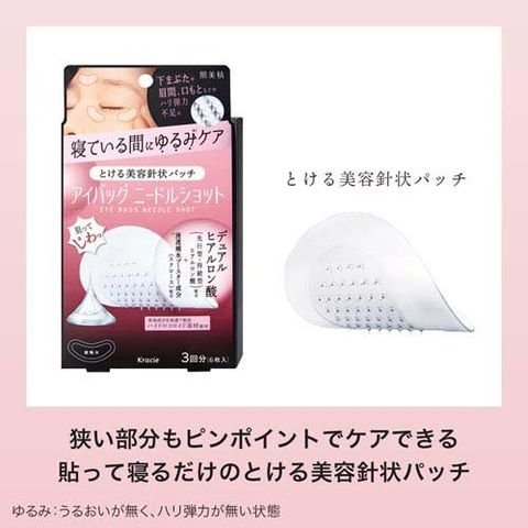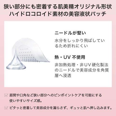 ●狙いを定めたポイント使いで寝ている間に目の下をハリケア。狭い部分にも密着し、美容成分を漏らさず押し込むハイドロコロイド素材シート採用。乾燥の気になる眉間や口もと、こめかみなどに貼れる溶ける美容針状パッチ。翌朝の肌へ、ポジティブなハリ弾力体験を。