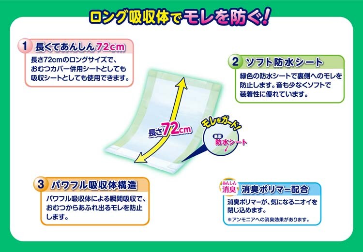 | シートサイズ:30*72cm 吸収回数の目安:排尿約3回分(1回の排尿量150mLとして) |